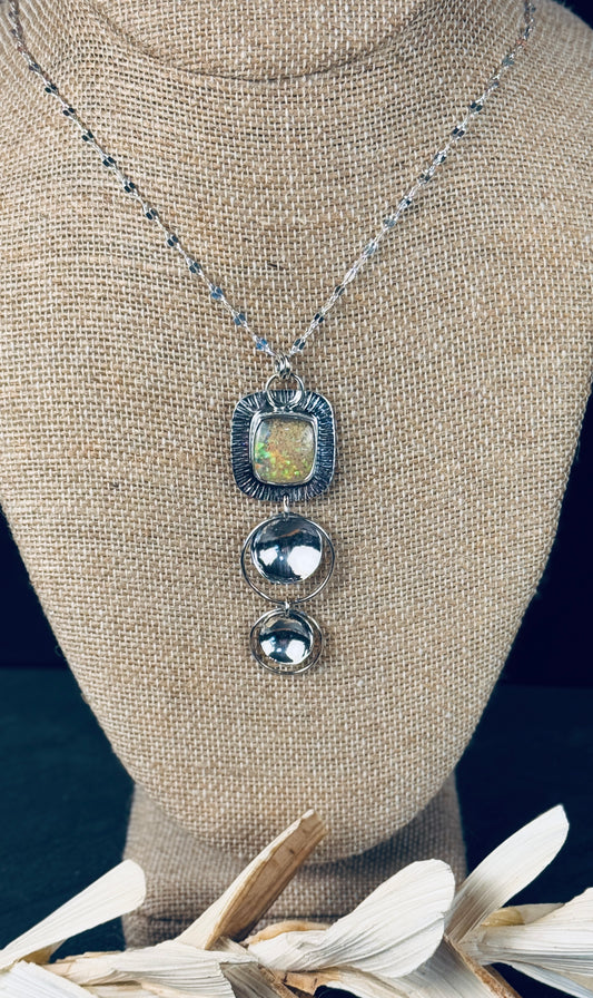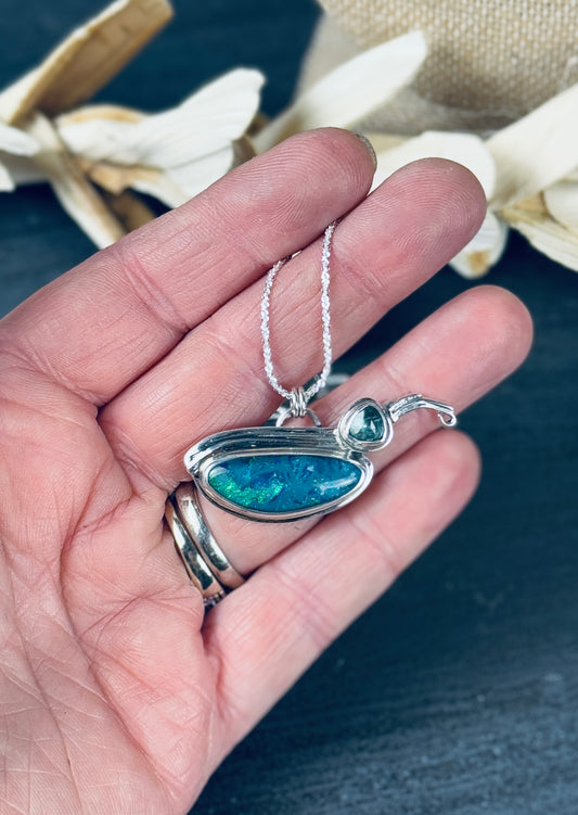 • Sterling Silver Wave with Boulder Opal and Emerald Bio Green Kyanite Pendant