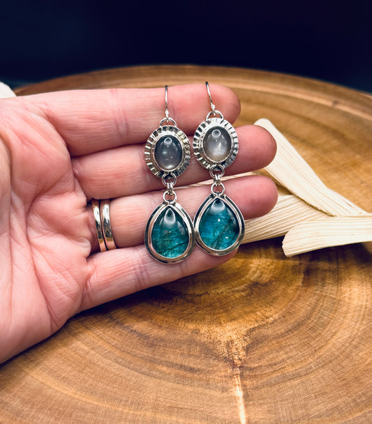 Smokey Petrified Wood and Teal Moss Kyanite Earrings