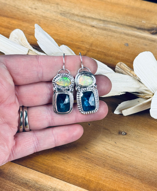 • Paraiba Kyanite and Ethiopian Welo Opal Earrings
