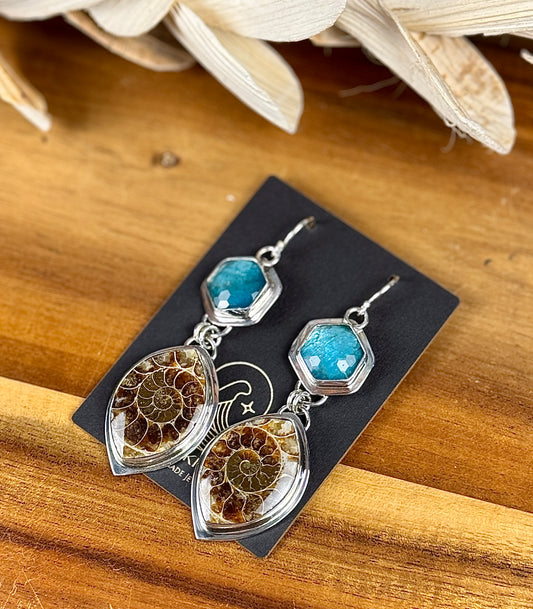 Sterling Silver Ammonite and Checkboard Cut Apatite Doublet Earrings