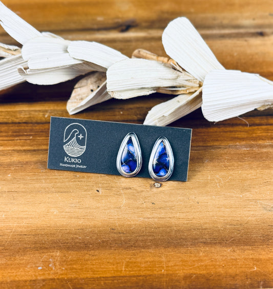 • Blue Opalized Wood and Black Onyx Sterling Silver Earrings