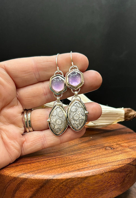 Fossilized Coral and Amethyst MOP Doublet Earrings