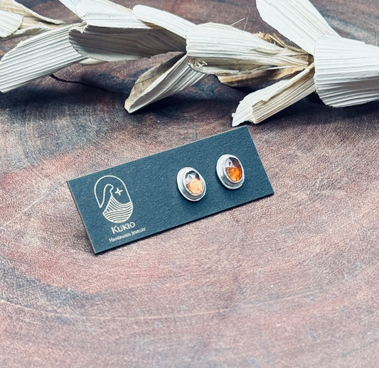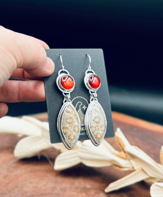 • Fossilized Coral and Hessonite Garnet Sterling Silver Earrings