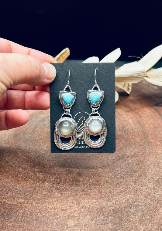 • High Dome Gray Moonstone and Turquoise Sterling Silver Earrings