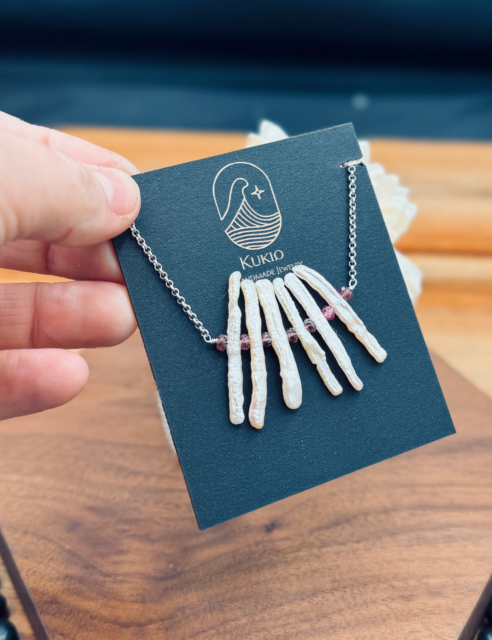 This one-of-a-kind necklace features six stunning Biwa pearls, each glowing with a soft blush-pink hue and beautiful iridescent tones that shift in the light. Their organic shapes give the piece an effortless elegance, while pink tourmaline beads placed between each pearl add a subtle sparkle and warmth. Thoughtfully handcrafted, this necklace balances softness and refinement, making it equally perfect for everyday wear or special moments. Finished with a sterling silver chain and clasp, it’s a timeless piece designed to be cherished for years to come.