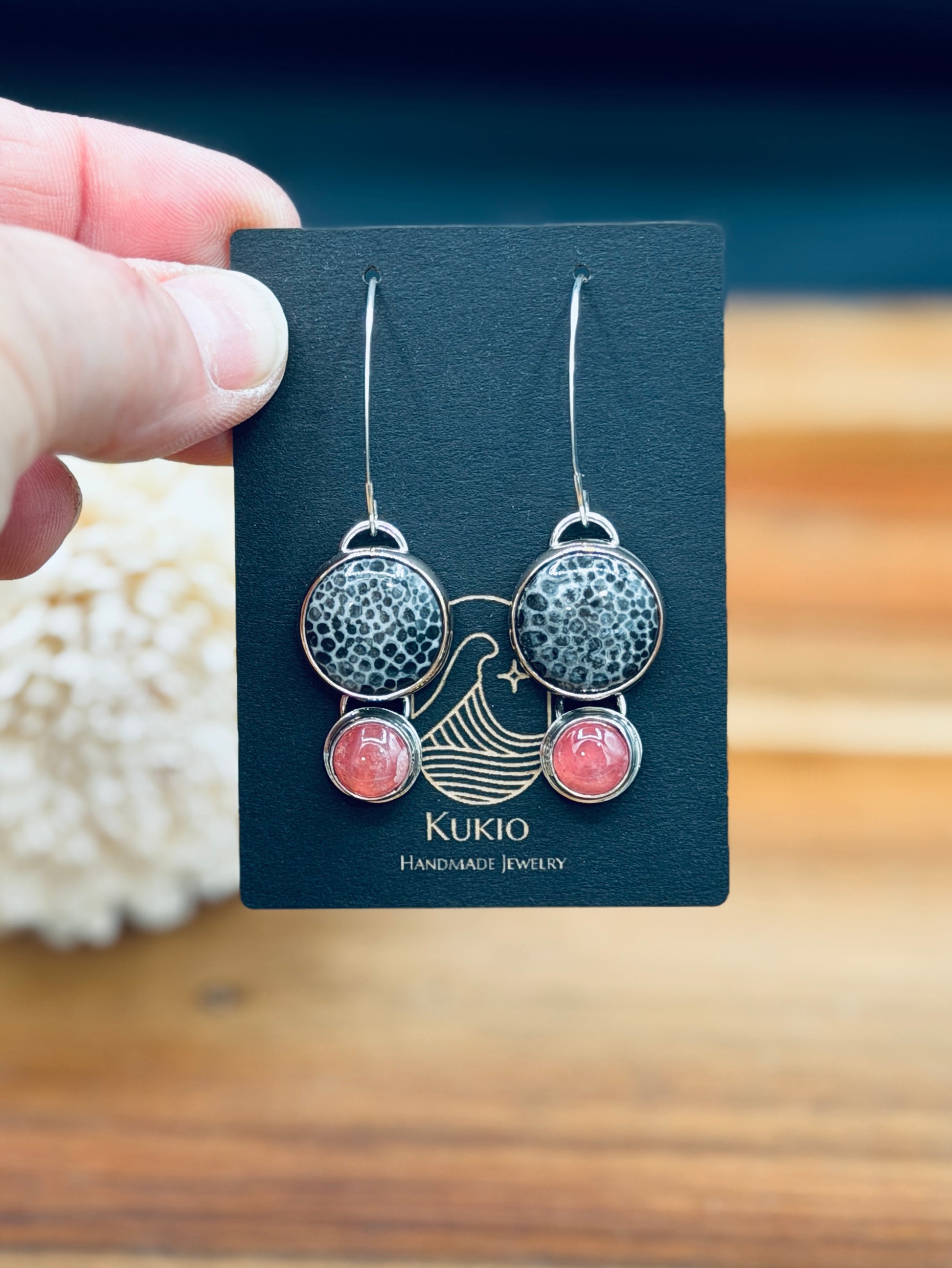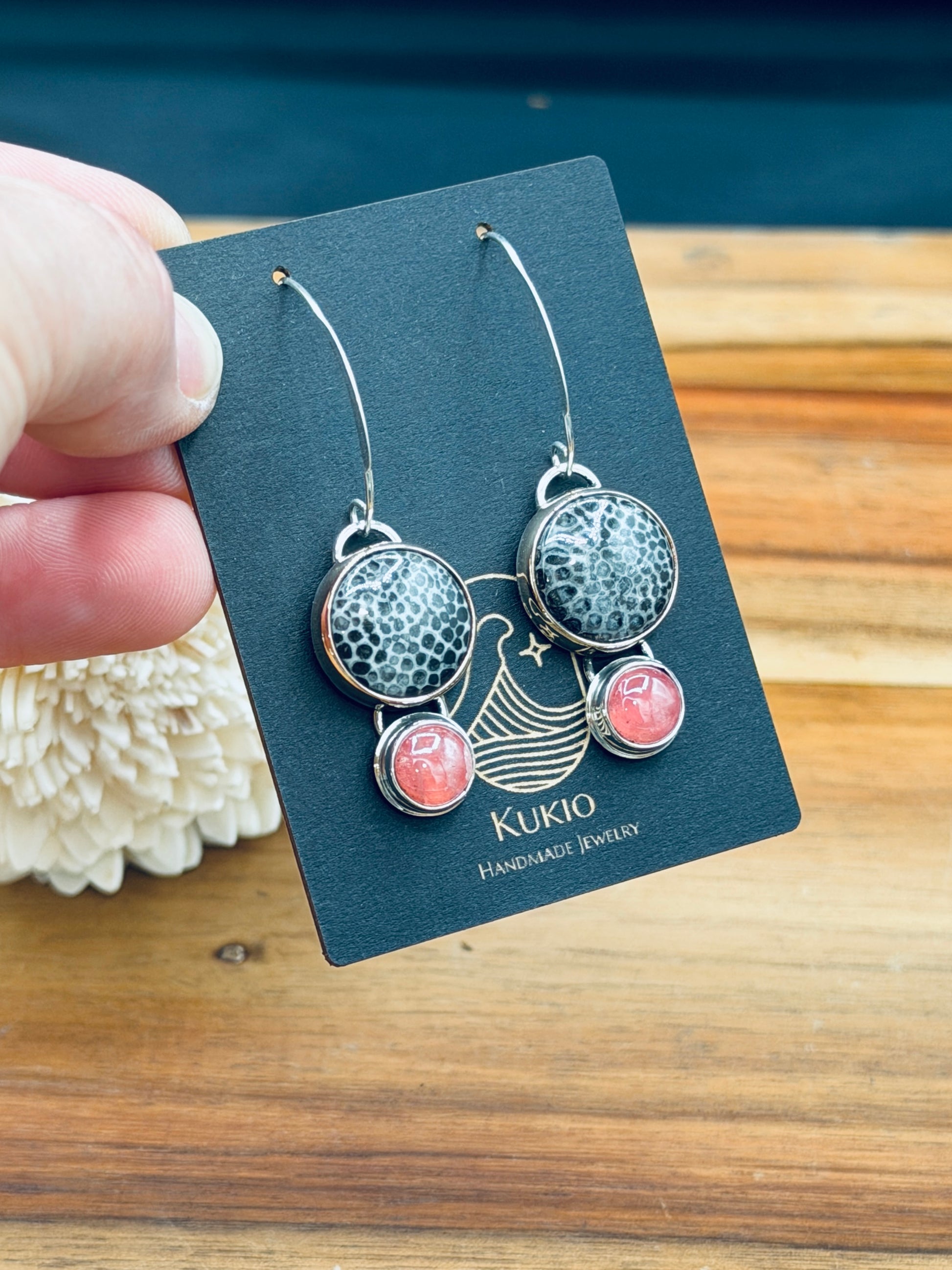 These stones are nothing short of breathtaking together. Vivid black horn coral is set into luminous sterling silver landings and finished with a hand-wrapped 14k gold-fill bezel for a striking contrast of dark, light, and glow. The pop of bright pink Rhodochrosite brings just the right amount of warmth and fire. Designed as long dangles, these earrings sway with effortless movement and fall at a beautifully flattering length. Handmade and one of a kind.