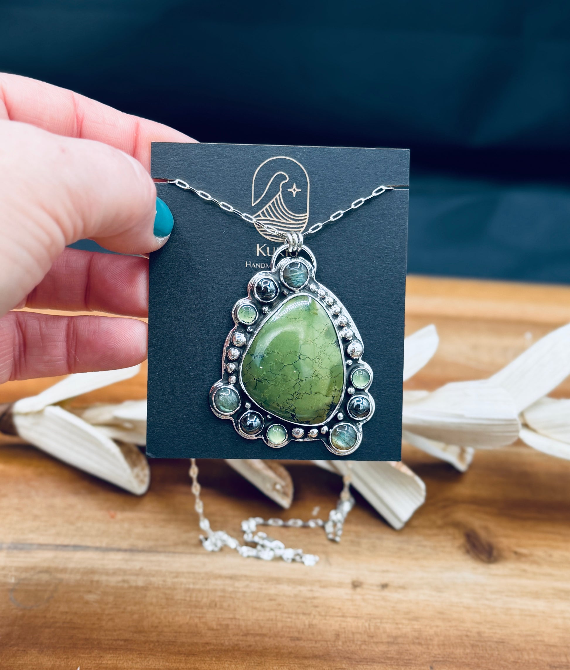Hubei Turquoise with forest greens and golden veining, reminiscent of deep woods and sunlight. Accented with Hematite, Labradorite, Serpentine, and silver balls that add texture, depth, and shimmer. This bold statement piece is handmade and one of a kind. All sterling silver and fine silver settings and accents. This piece comes with a 20 inch sterling silver chain.