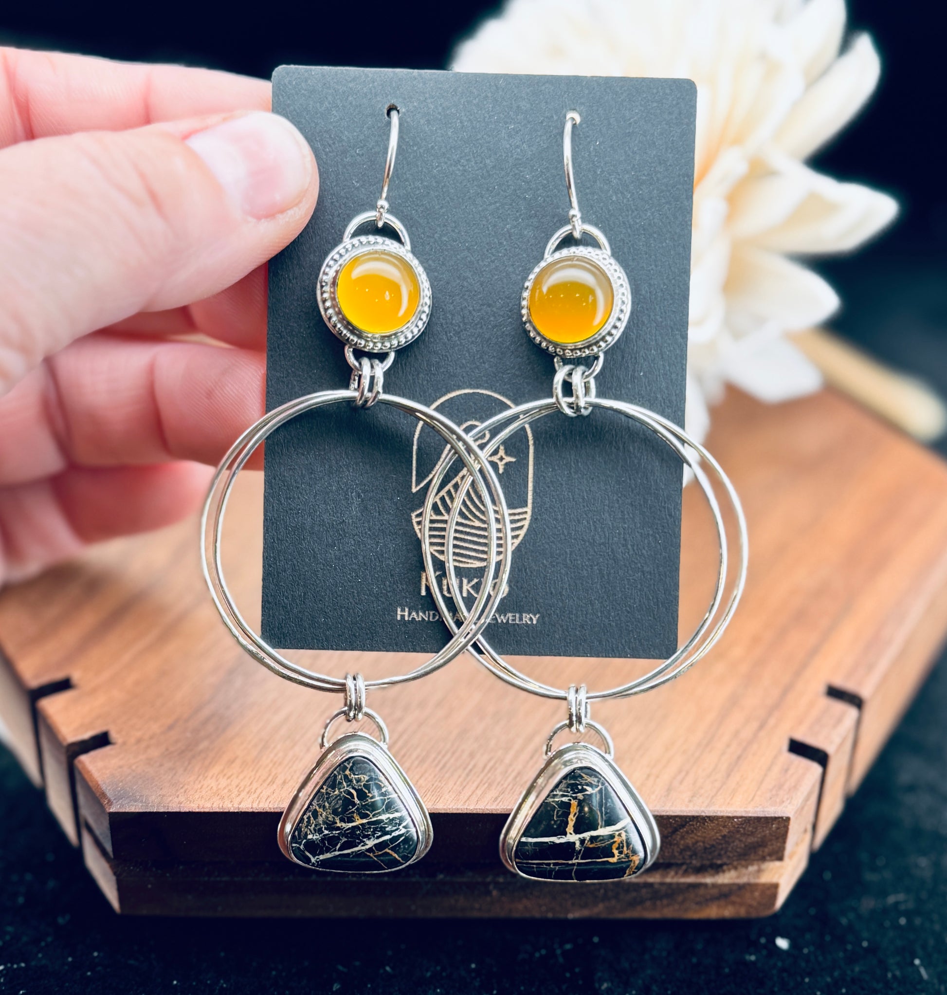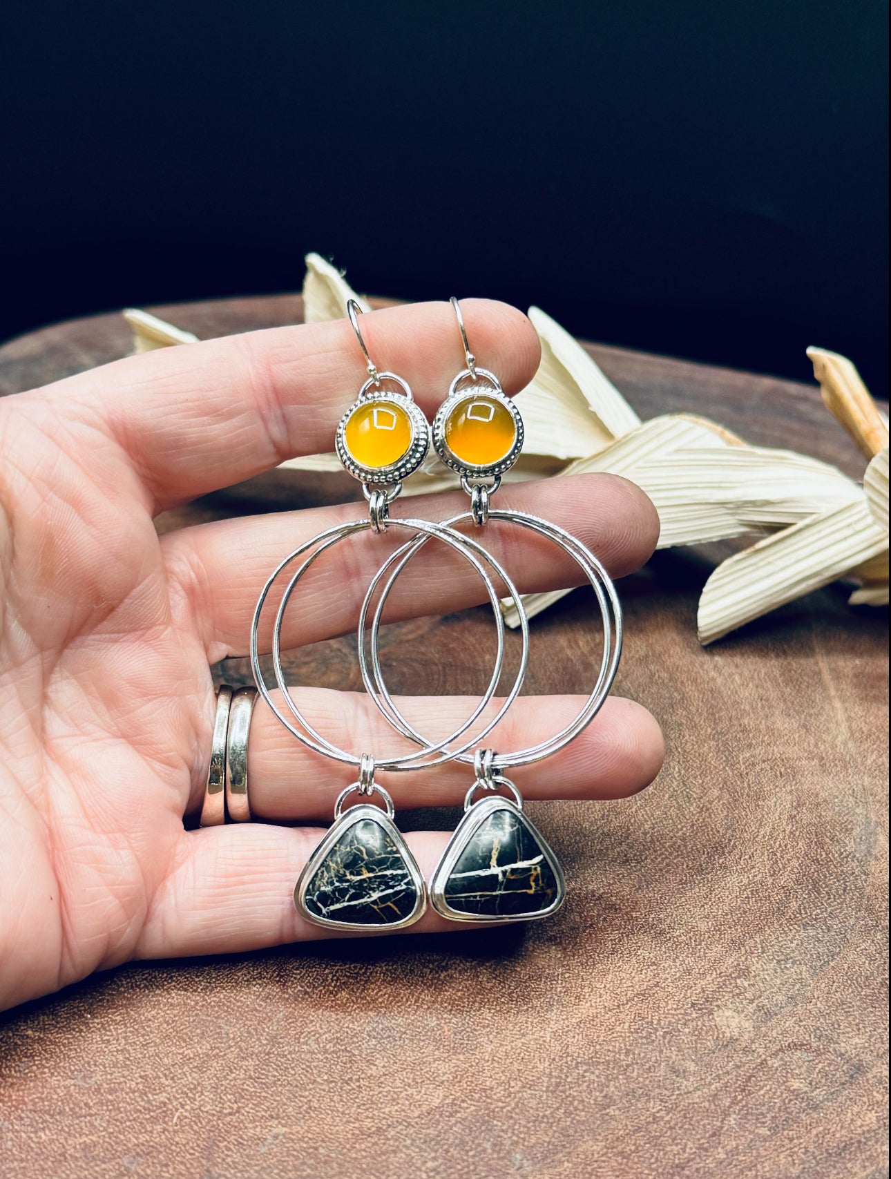 These fun earrings have movement and sparkle from the shiny sterling silver and vibrant Mango Chalcedony stones. Double hoops give these big earrings an airy, lightweight feel. The Iron Buffalo stones have striking yellow and orange veining that give them such a unique, eye-catching style. Handmade and one of a kind.