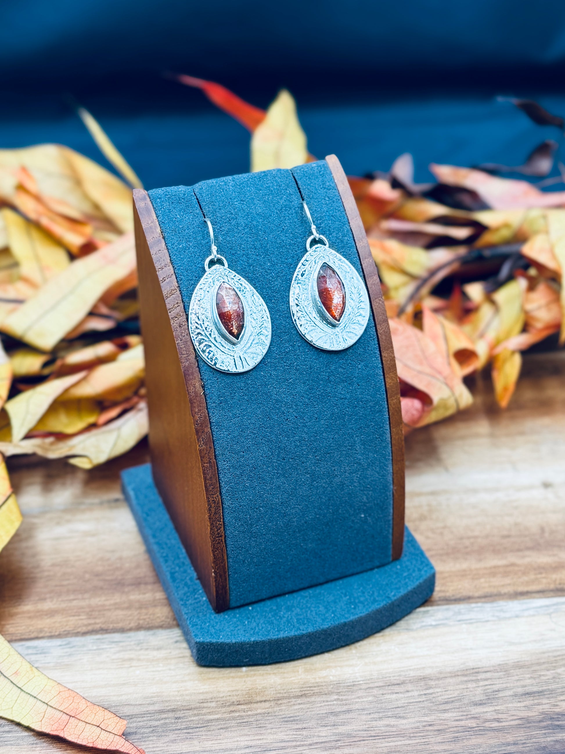 These earrings bring together the warmth of Magras Sunstone with the shine of hand-patterned sterling silver. The stones shimmer with fiery flecks of gold and orange, like sunlight caught in motion framed in silver that’s been textured for extra depth and detail.