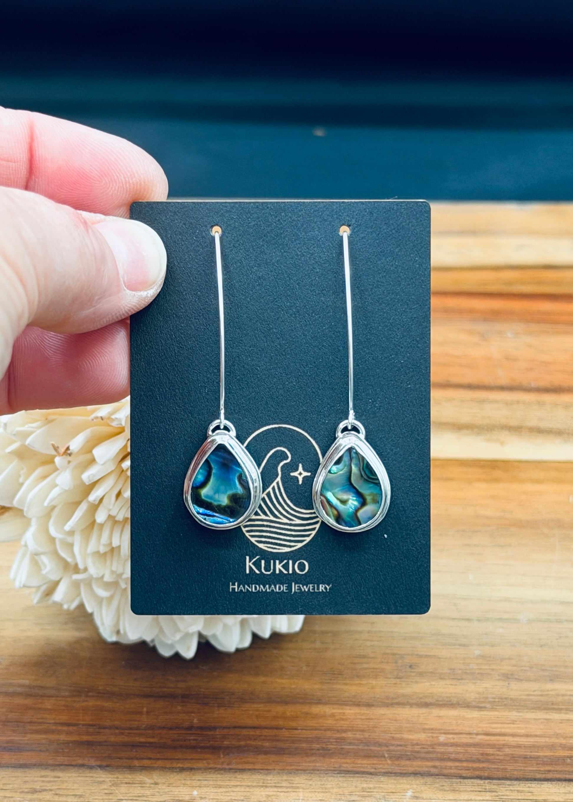 Handcrafted to capture the glow of the sea, these long dangle earrings feature natural abalone shell framed in sterling and fine silver. Each shell shimmers with layered hues of ocean blue, moss green, and soft violet. Designed for graceful movement and effortless elegance, these lightweight dangles catch the light with every turn of your head. The elongated silhouette flatters the neckline. Handmade and one of a kind.