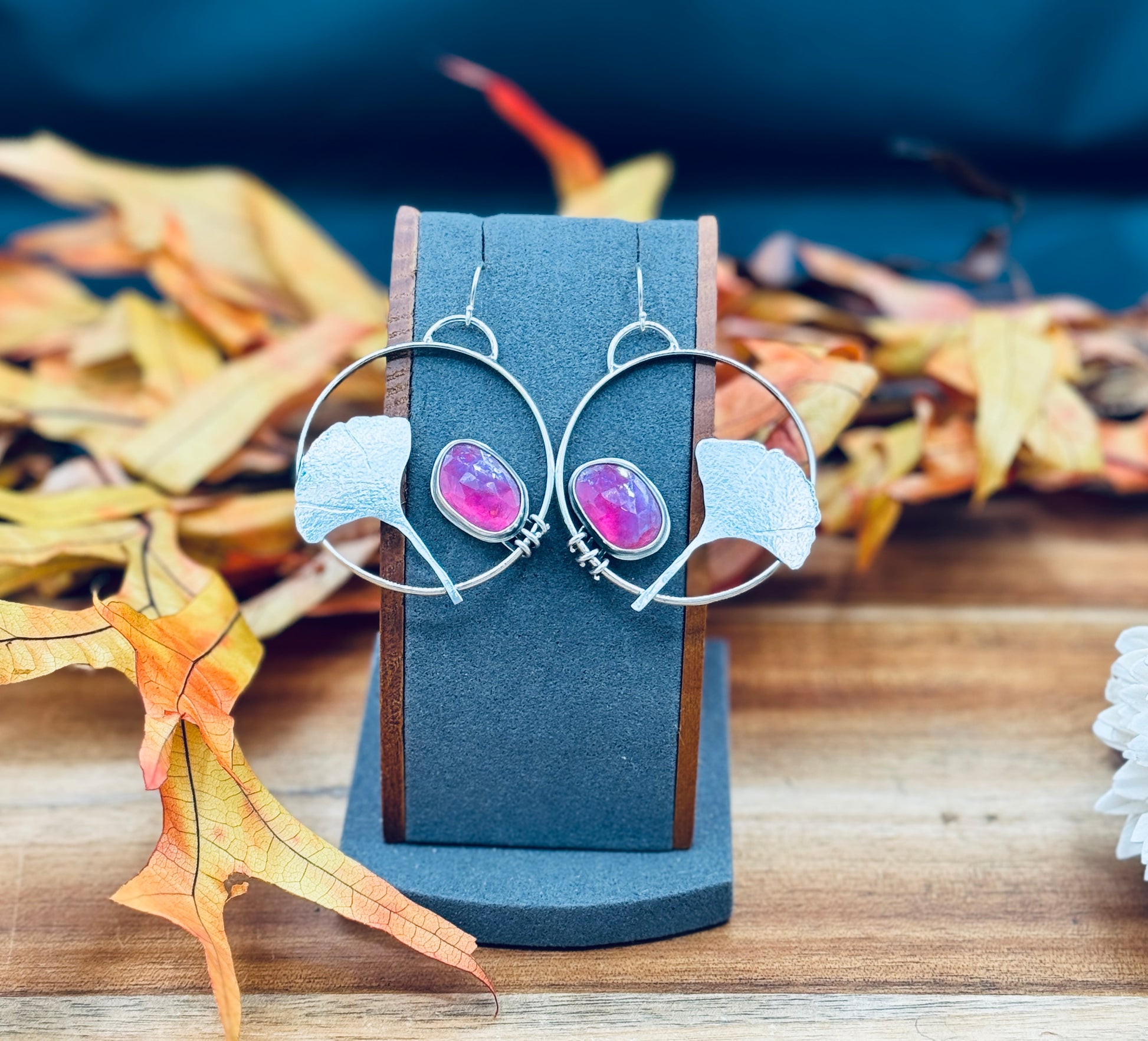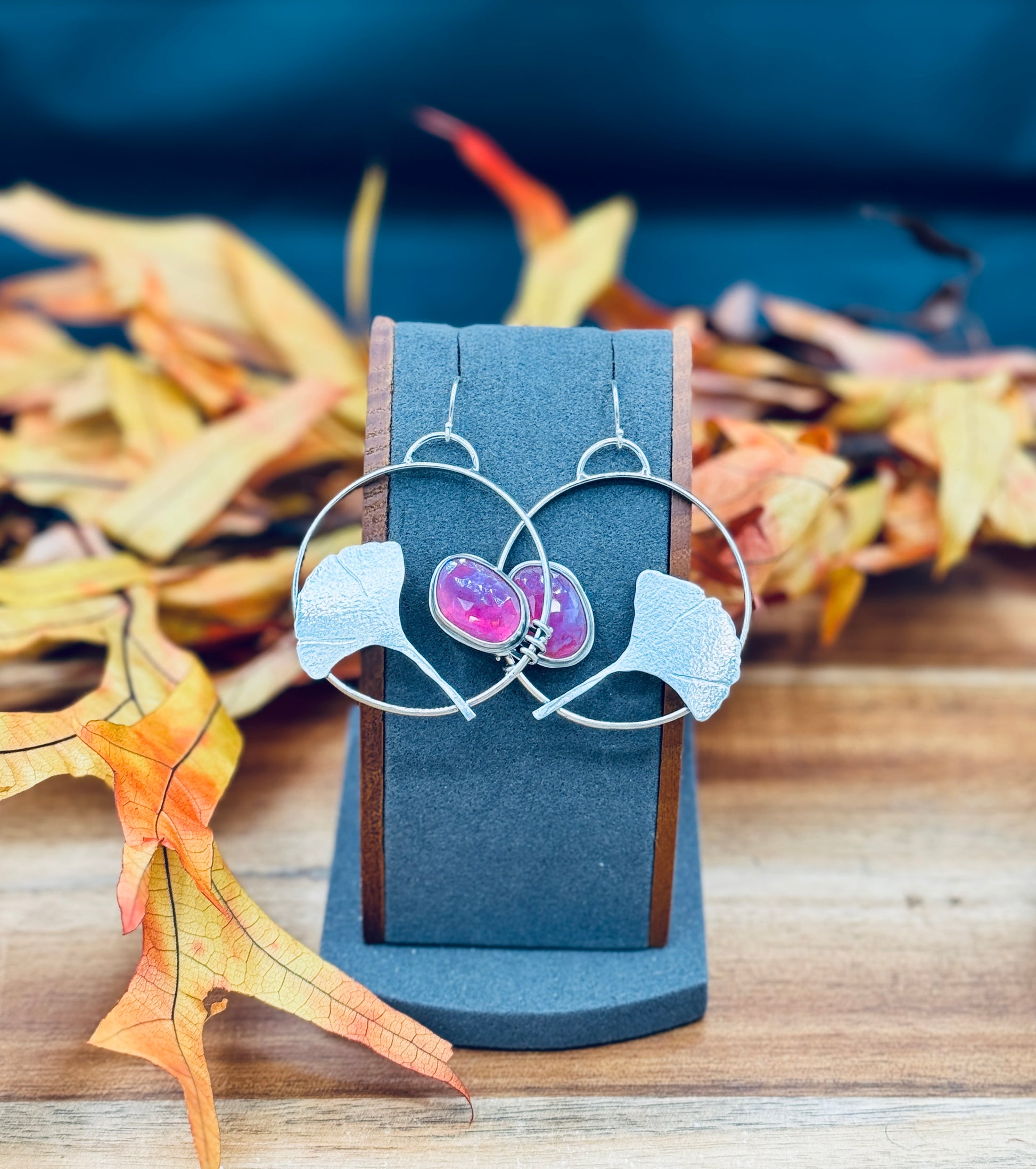 Sterling Silver Ginkgo Leaf Pink Sapphire Hoop Earrings