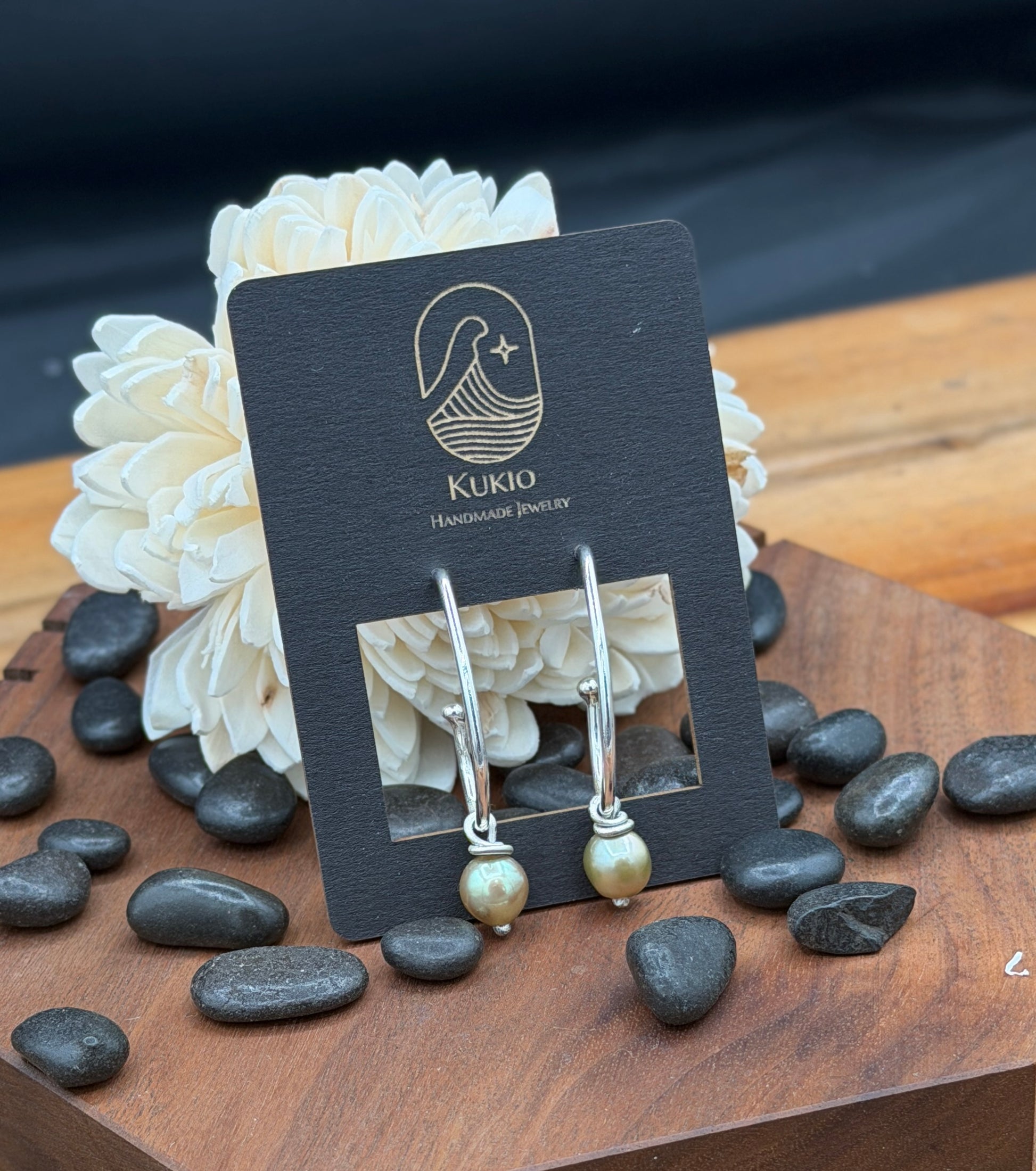 Beautiful green freshwater pearls sway effortlessly from hand-formed sterling silver wave hoops, catching the light with every movement. Comfortable sterling silver studs keep these earrings perfectly balanced, allowing the pearls to float gracefully from the ear.