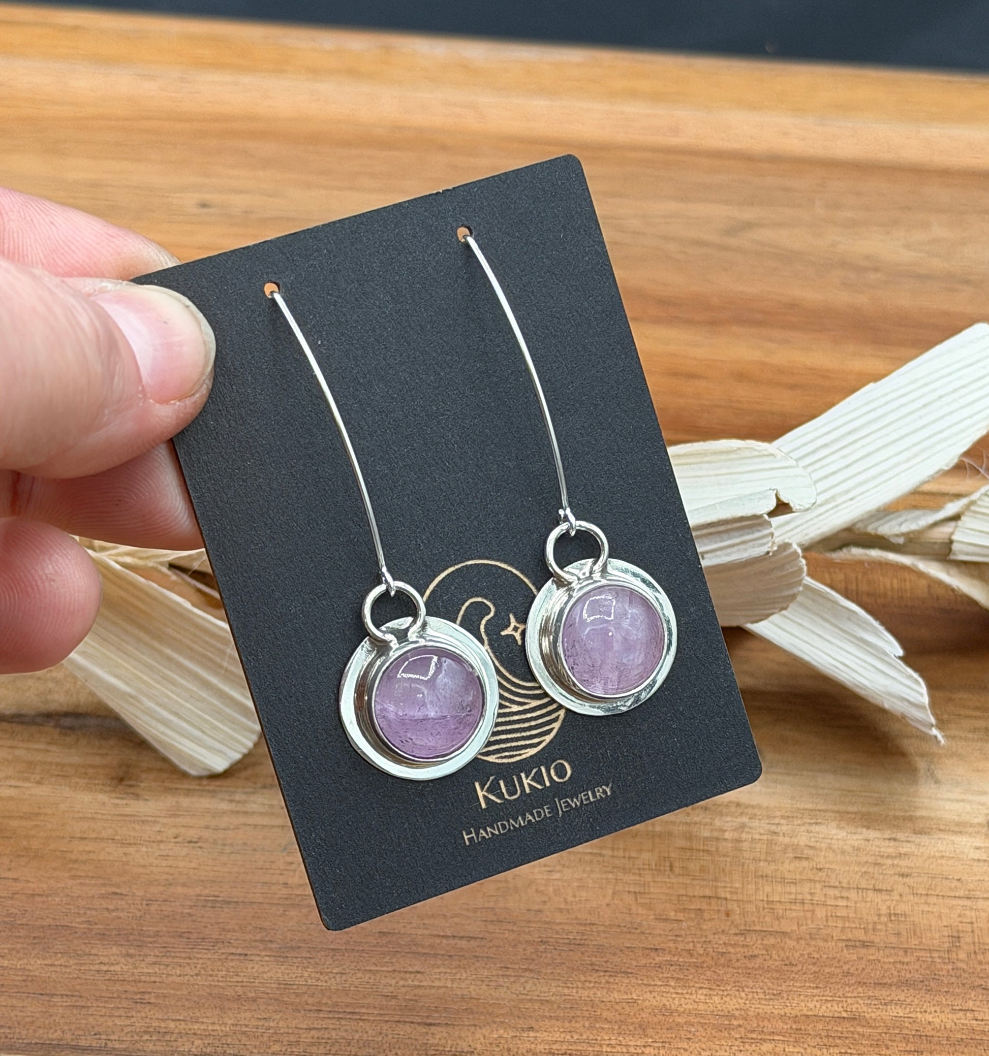 Handcrafted from sterling silver, these dangle earrings feature stunning lavender-pink Kunzite stones that glow with soft, feminine energy. The gems rest on wide silver landings that frame and reflect their color beautifully. Each earring hangs from an elegant long ear wire, allowing subtle movement that catches the light with every turn. Modern yet timeless, these earrings are a perfect statement of handcrafted artistry — unique, radiant, and unmistakably one of a kind.