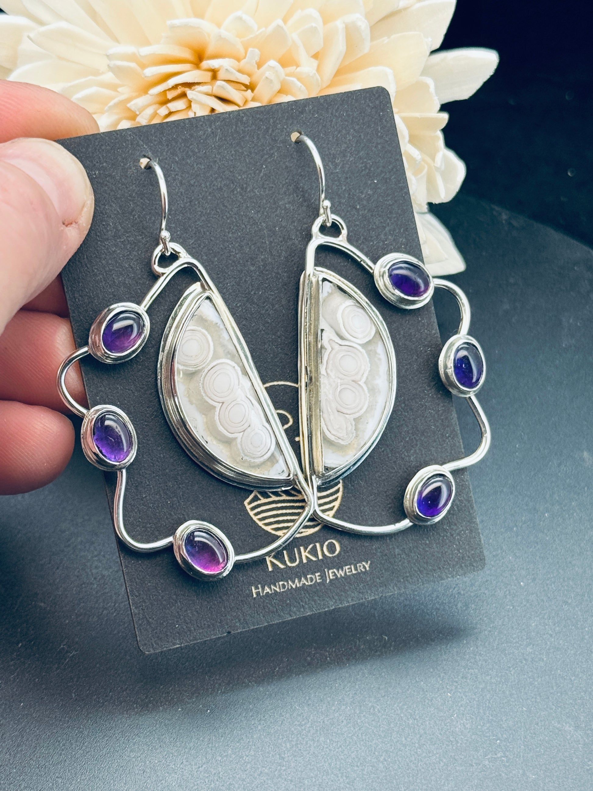 Sterling Silver Orbicular Agate and Amethyst Earrings
