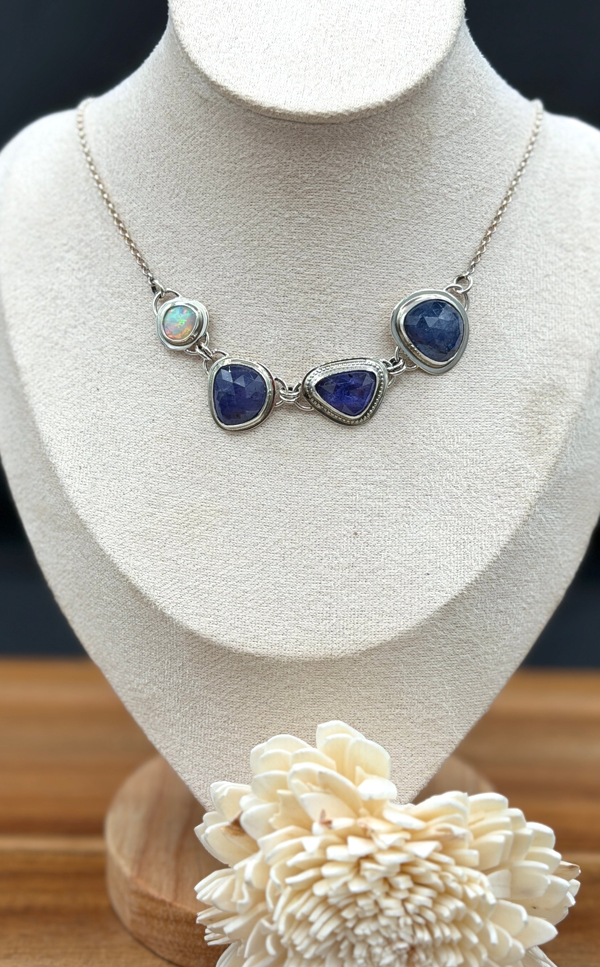 Sterling silver necklace featuring a stunning trio of Tanzanite, Iolite, and Opal. Each stone is set on wide sterling silver landings, with the Iolite wrapped in delicate beaded silver wire for added texture. Double hoops connect each setting, allowing the necklace to lay beautifully balanced. The rose-cut facets of these luminous stones catch the light from every angle, keeping this piece sparkling. Handmade and one of a kind.