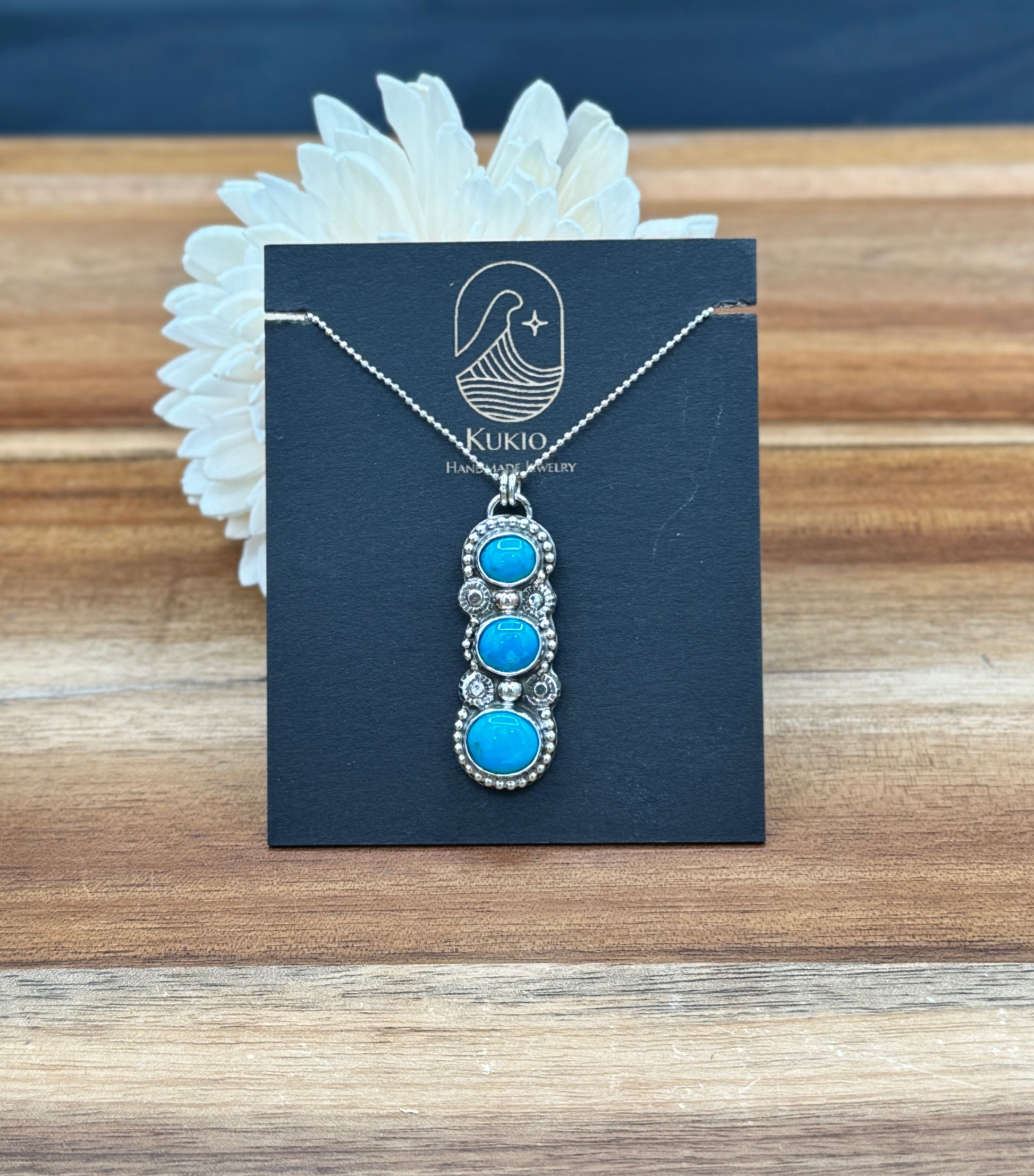 Three flawless Royston Turquoise stones rest on a hand-crafted sterling silver landing, each one wrapped in fine silver. The stones are accented with silver balls, ball wire, and stamped details that give this piece texture and depth. Double hoops keep it perfectly balanced as it hangs from a sterling silver chain (included).